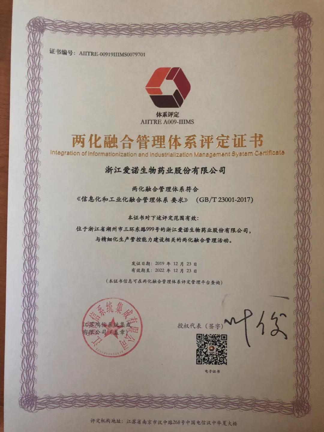 公司根據《信息化和工業化融合管理體系 要求》(GB/T 23001-2017)標準,正式啟動“兩化融合”管理體系貫標工作,經過自主申報、體系運行、內部審核、管理評審、專家評審和復核公示等環節,于2019年12月正式通過評定,取得兩化融合管理體系評定證書(編號:AIITRE-00919IIIMS0079701)。公司兩化融合管理體系通過評定,公司將持續進行新型能力的打造,不斷提升兩化融合水平,增強企業的核心競爭力。