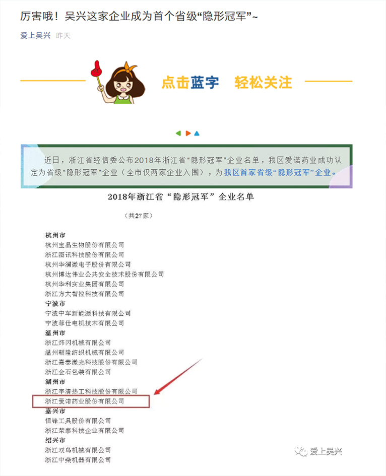 恭喜愛諾藥業成為吳興區首個省級“隱形冠軍”~