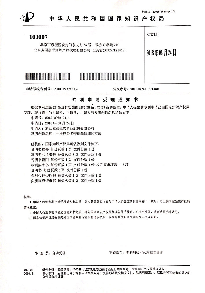 喜報(bào):恭喜浙江愛(ài)諾生物藥業(yè)股份有限公司獲得專(zhuān)利:“一種恩替卡韋粗品的純化方法”,在此特向一直以來(lái)關(guān)心支持本企業(yè)的各位領(lǐng)導(dǎo),各位朋友衷心表示感謝!