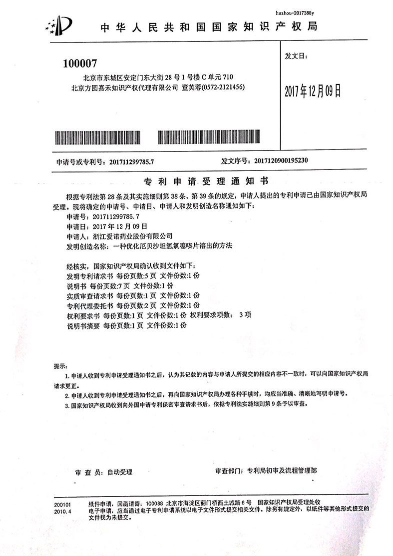 喜報(bào):恭喜浙江愛(ài)諾生物藥業(yè)股份有限公司獲得專利:“一種優(yōu)化厄貝沙坦氫氯噻嗪片溶出的方法”,在此特向一直以來(lái)關(guān)心支持本企業(yè)的各位領(lǐng)導(dǎo),各位朋友衷心表示感謝!