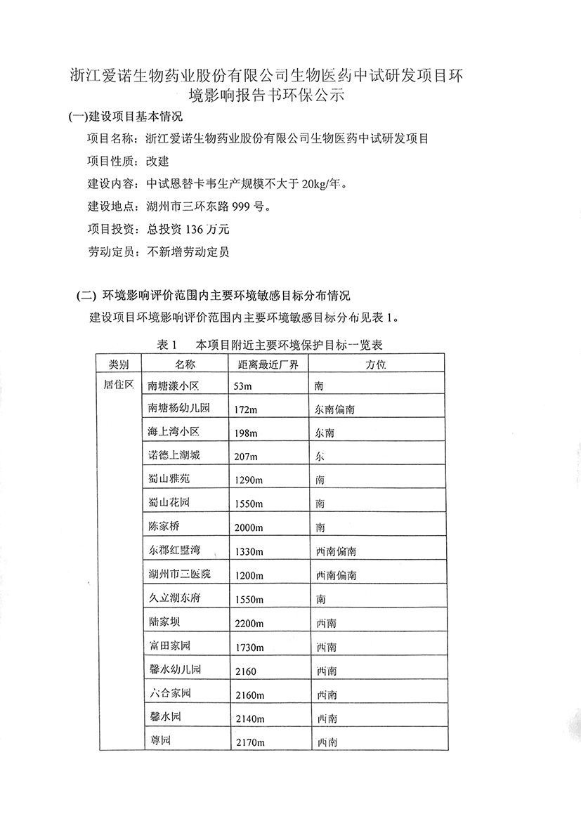 浙江愛諾生物藥業股份有限公司生物醫藥中試研發項目環境影響報告書環保公示